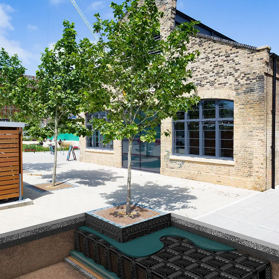 Integrierte Systeme für vitale Stadtbäume und nachhaltiges Regenwassermanagement.