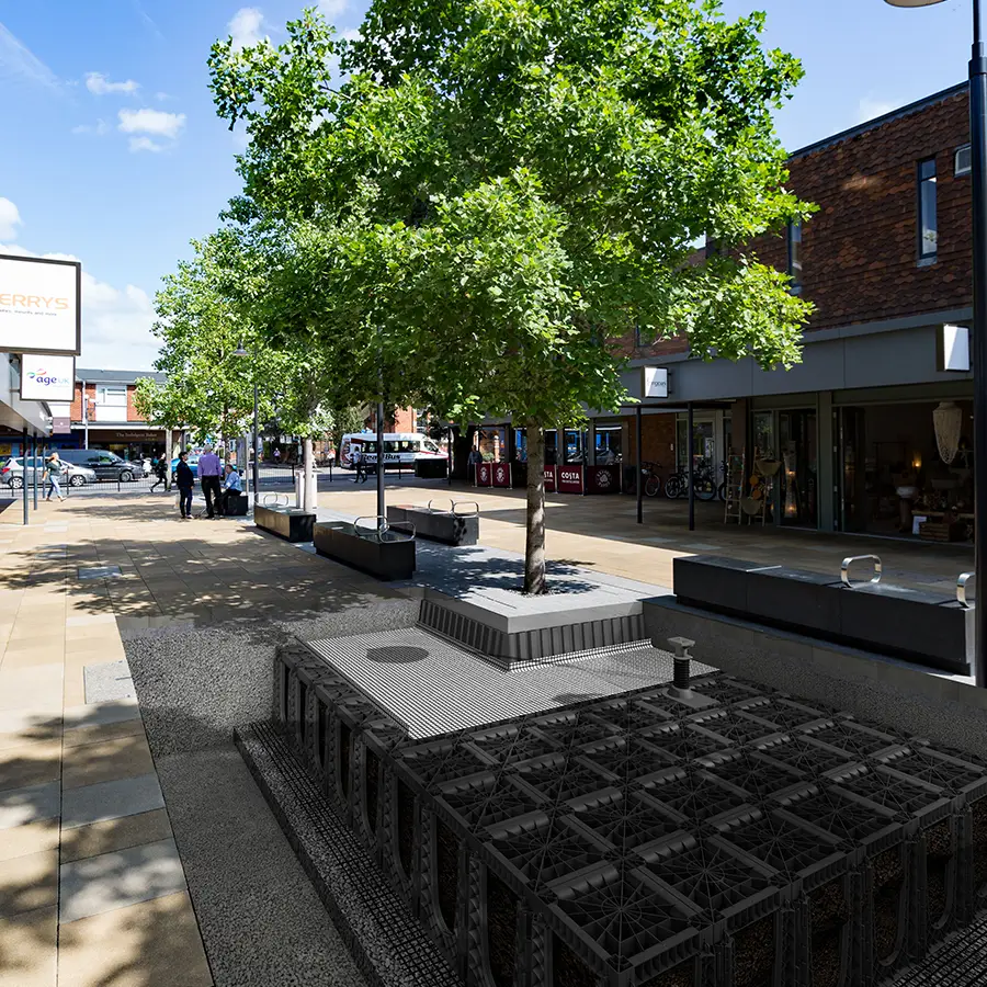 Wir bieten SuDS (Nachhaltige Entwässerungssysteme)-fähige Baumgruben, Regengärten und Pflanzgefäße, um Regenwasser dort zu bewirtschaften, wo es anfällt – durch Rückhaltung, Filterung und nachhaltige Ableitung des Wassers, während gleichzeitig gesündere Landschaften und widerstandsfähigere Straßenräume unterstützt werden.