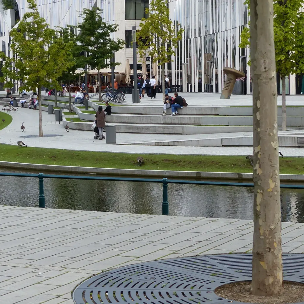 In diesem Kontext kombinierte das Planungsteam die Oberflächenerneuerung mit technisch ausgelegten Baumgruben, damit sich die Wurzeln robust unter der befestigten Oberfläche entwickeln können – für optimales Kronenwachstum und langfristige Vitalität – während der Straßenraum zugleich sauber, begehbar und dauerhaft schadensfrei bleibt. Die Projektziele umfassten darüber hinaus gebäudeintegrierte Begrünungsmaßnahmen innerhalb des Ensembles (darunter begrünte Dächer und gestaltete Vorplätze); die Straßenbepflanzung wurde als Teil dieses Gesamtkonzepts betrachtet, um Vegetation zu integrieren und Regenwasser innerhalb der innerstädtischen Struktur zu bewirtschaften.