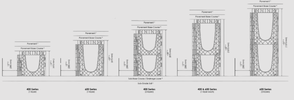 This flexibility allows designers to achieve the soil volumes required for healthy tree growth across a wide range of urban planting conditions.