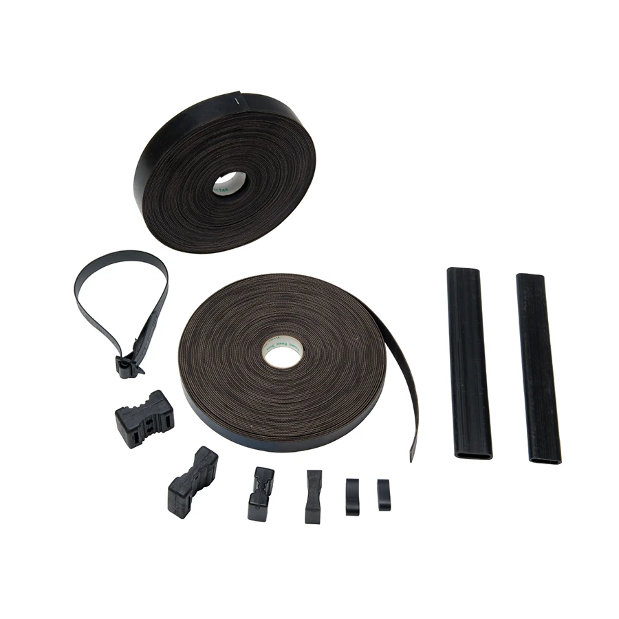 Nylonverstärkte Gummibänder in verschiedenen Größen sowie Jutebänder des Typs NatureTie, die sich während der Etablierungsphase des Baumes biologisch zersetzen.