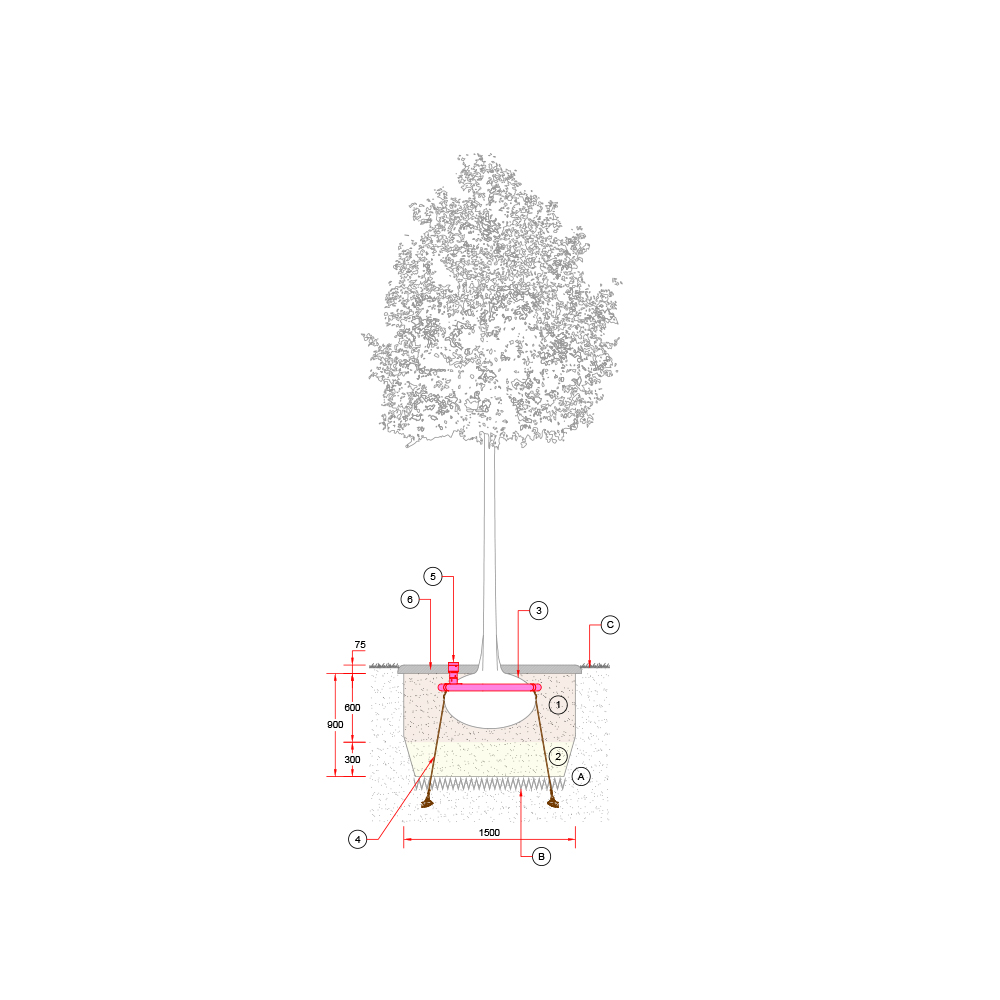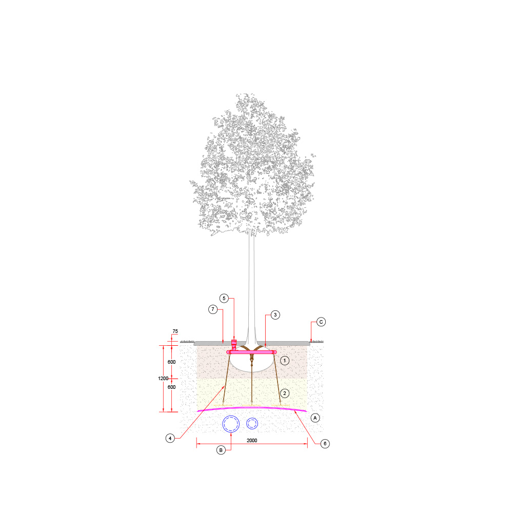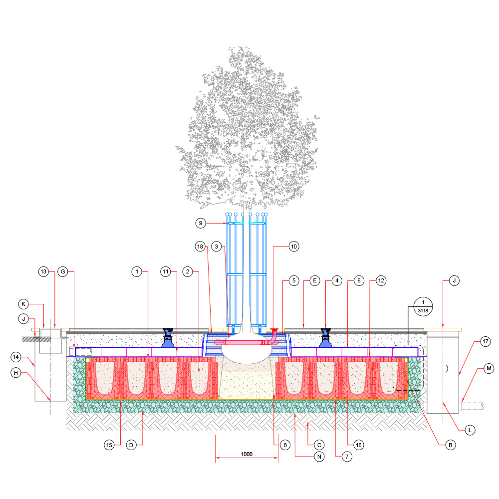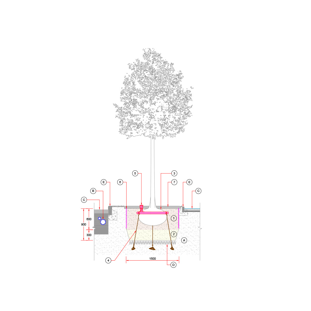 Baumgrube in Grünflächen mit unterirdischen Leitungen und horizontalem Wurzelschutz.