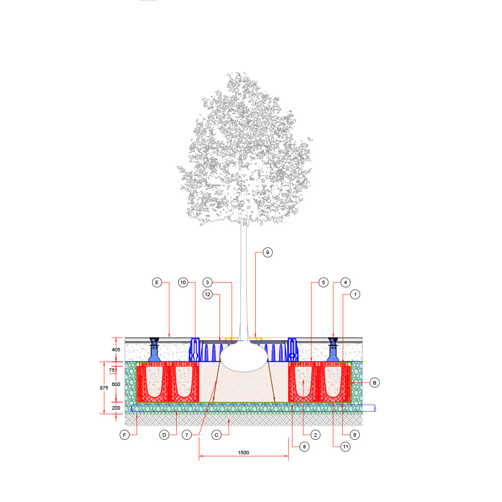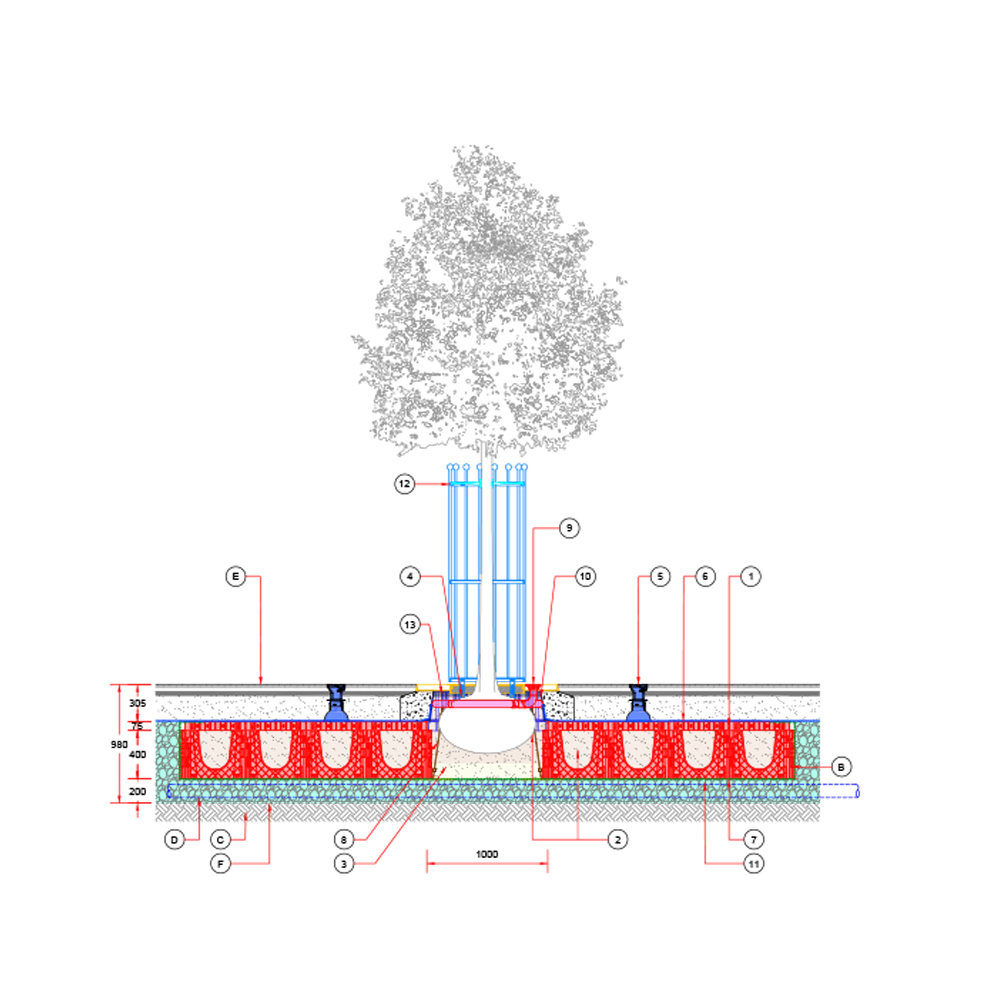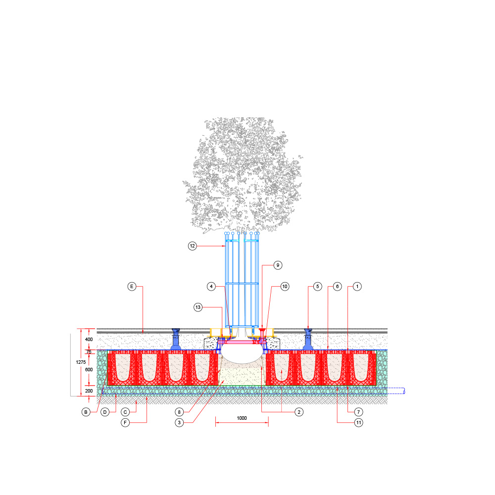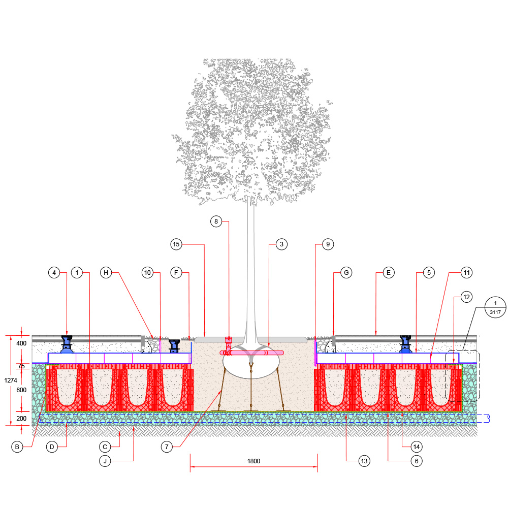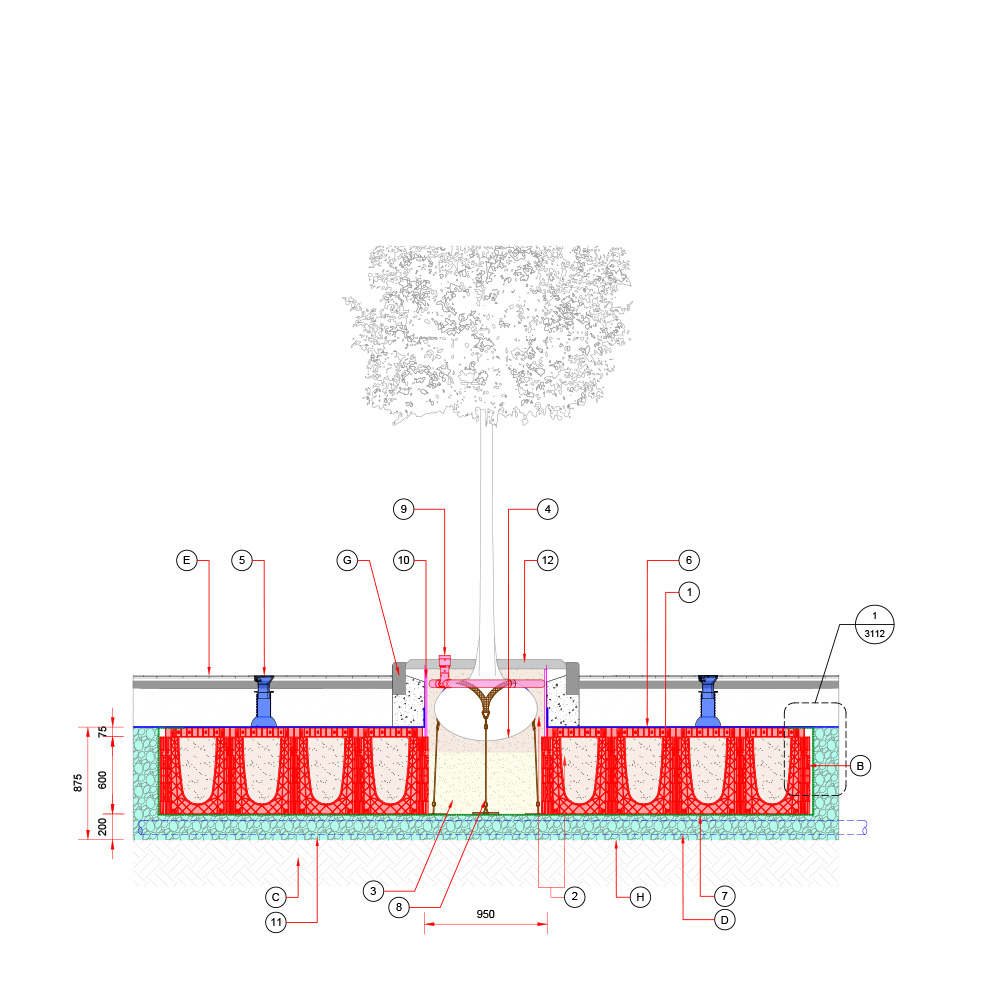 Baumgrube für sehr großwüchsige Baumarten in befestigter Fläche – RootSpace 1200.