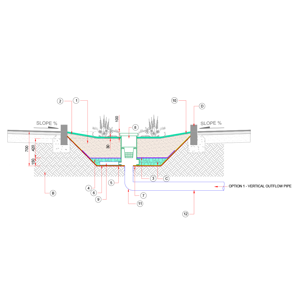SuDS-Regenbeet mit RootSpace-Volumen beidseitig für mittelgroße bis große Baumarten.